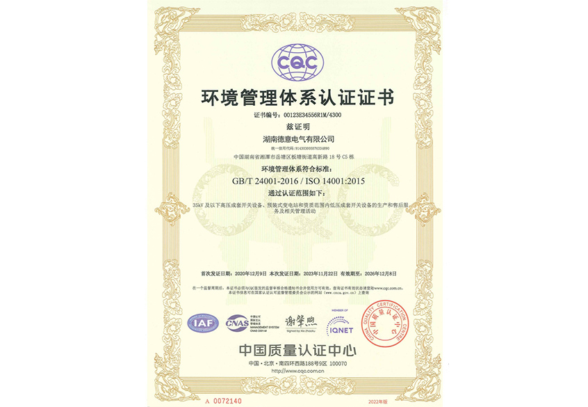 環(huán)境管理體系認證證書